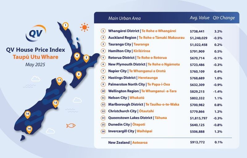 The latest QV House Price Index shows Auckland property values continued to soften in the May 2025 quarter, while Northland saw modest growth.