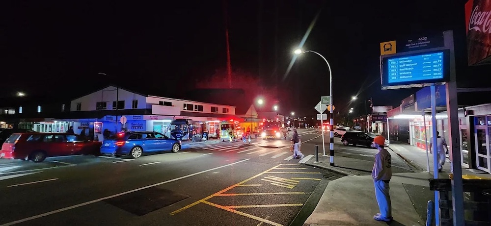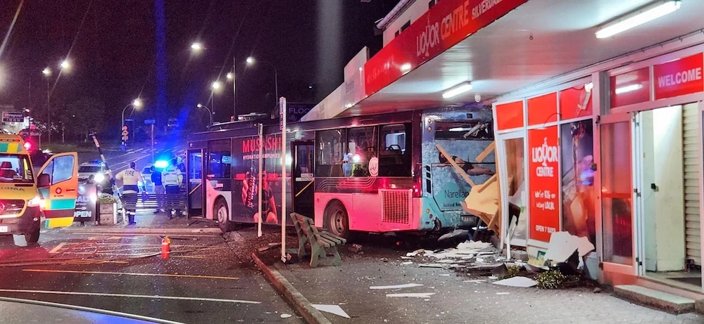 Evening smash damages two village shops. Photo: RedditA bus has crashed into a liquor store in Silverdale village, leaving two people injured and causing damage to neighbouring businesses.