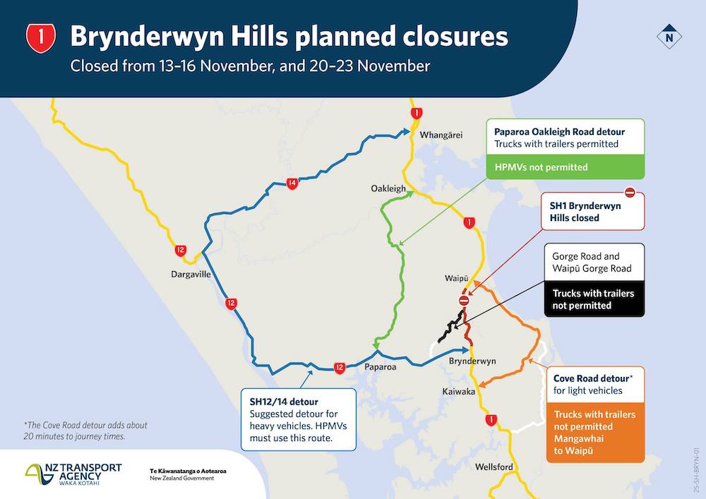 The closure area runs from the SH1/SH12 intersection on the south side to the bottom of the hill on the north side near Waipū Gorge Road, with clear detour signage in place.