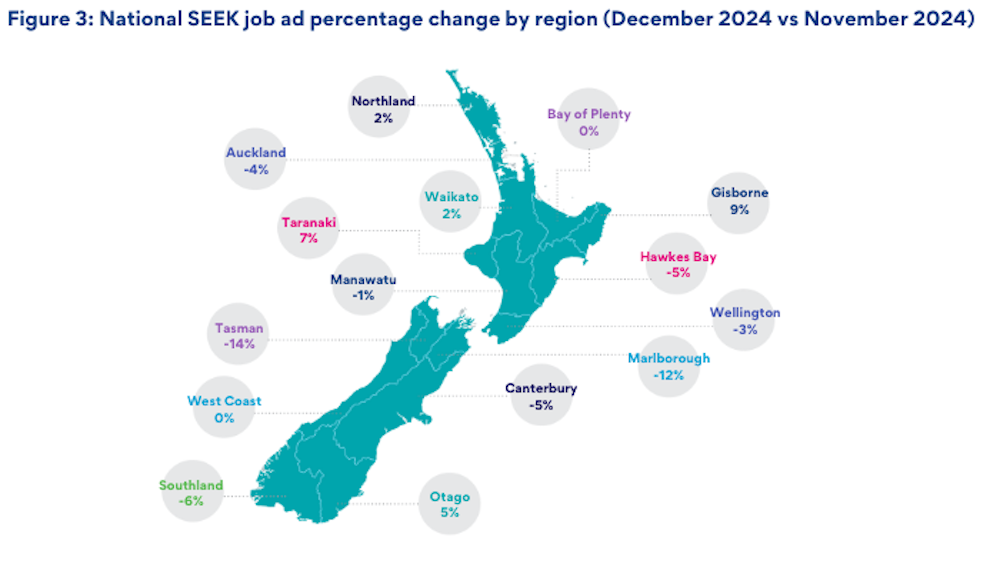 Auckland and Wellington have each fallen over 20% during the same period, while Taranaki’s job ad volumes have shown no change year-on-year.