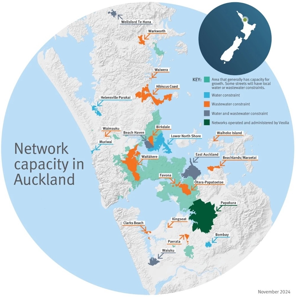 Watercare map of water and wastewater constraints in Auckland. Photo: Watercare
