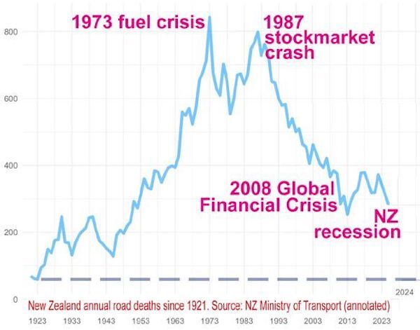 "The overall road toll in New Zealand has been steadily falling since the late 1980s, but the annual highs and lows of the toll closely follow the economy," he explains.