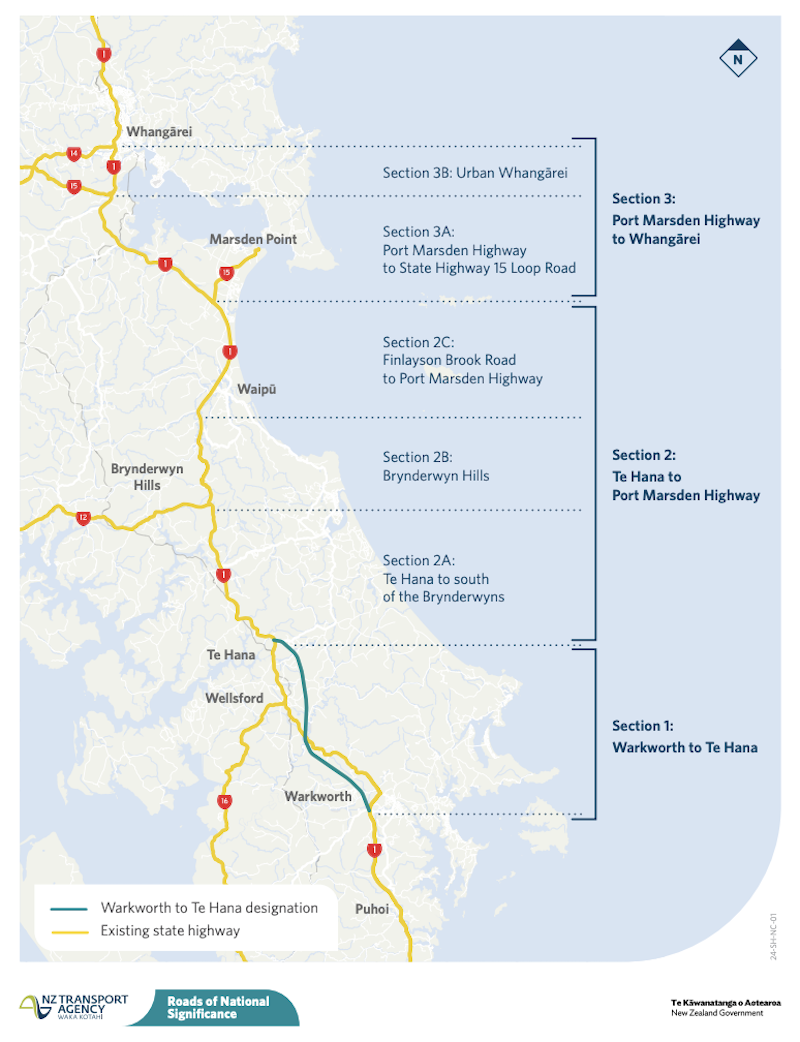 The first stage of the project, from Warkworth to Te Hana, was confirmed as a 26km four-lane expressway connected to the new Pūhoi to Warkworth expressway.
