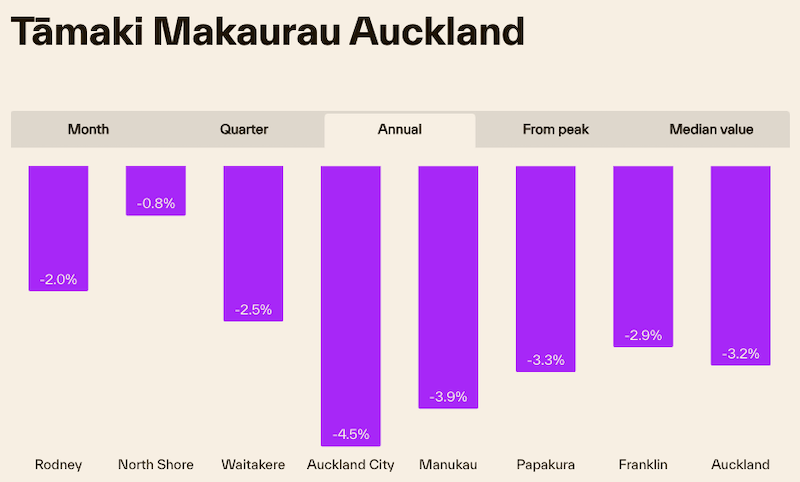 Rodney, Waitakere and Auckland City avoided falls, while North Shore, Manukau and Franklin each rose by 0.1%.