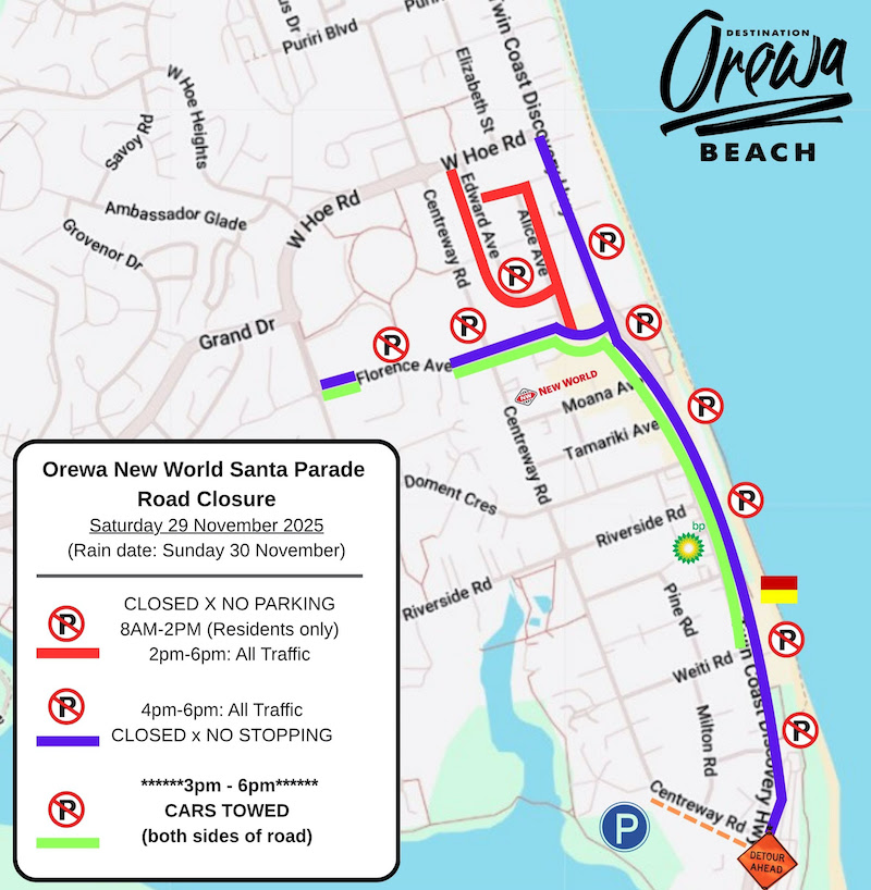 The parade begins at 4:30 pm, setting off from Hillary Square on Florence Avenue, then travelling down Hibiscus Coast Highway before finishing at the Orewa Beach Reserve car park next to the Surf Club.
