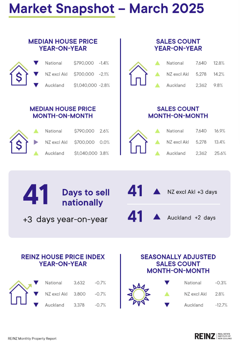 New national figures released by the Real Estate Institute of New Zealand (REINZ) show a 12.8% increase in sales compared to March 2024.