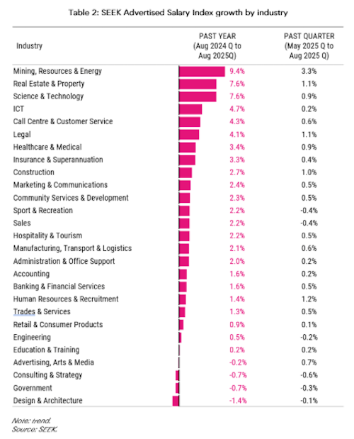 By industry, Mining, Resources and Energy roles topped the chart with advertised salaries up 9.4% over the year, though the sector remains relatively small.
