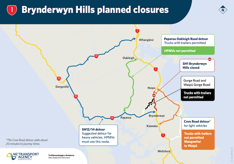 During both closures, three detours will keep Northland open: Cove Road for light vehicles, Paparoa Oakleigh Road for trucks up to 50MAX, and SH12/SH14 for larger freight.