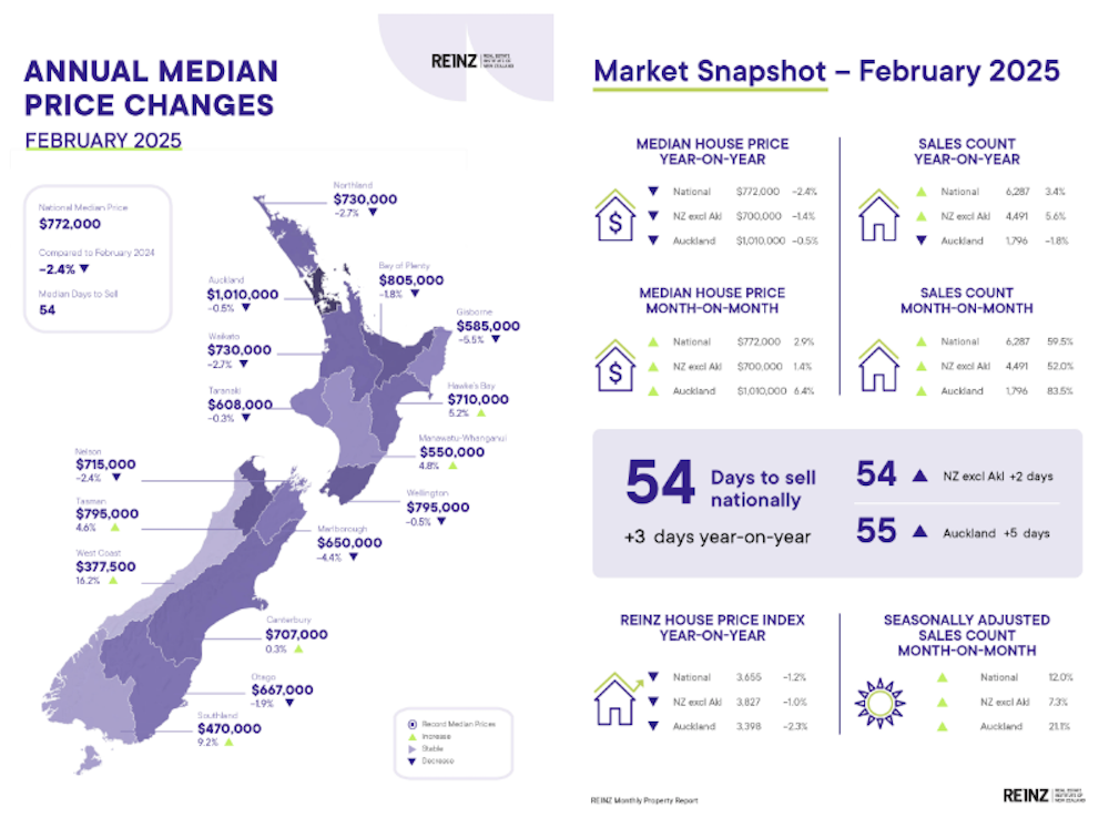 According to the Real Estate Institute of New Zealand (REINZ), 6,287 properties sold nationwide in February 2025—a 3.4% increase compared to February 2024.