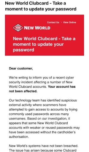Members of supermarket loyalty and online shopping programme New World Clubcard received an email on Friday night, telling them scammers had attempted to gain access to accounts by trying commonly used passwords.