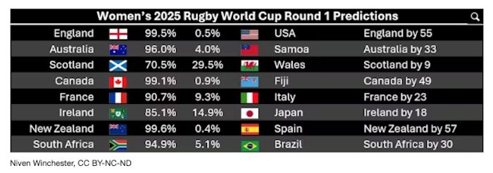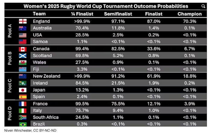 England, which has dominated women’s rugby in recent years and has home advantage, is overwhelming favourite with a 70.3% chance of winning the tournament.