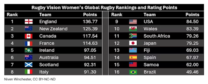 The Rugby Vision rankings are comparable to the official World Rugby rankings, but a key difference is that Canada is ranked ahead of New Zealand in the official standings.